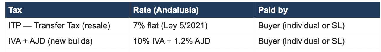 Let us address the most common misconception immediately. Whether you buy a resale property in Andalusia as a private individual or through a Spanish Sociedad Limitada (SL), the acquisition taxes are identical: