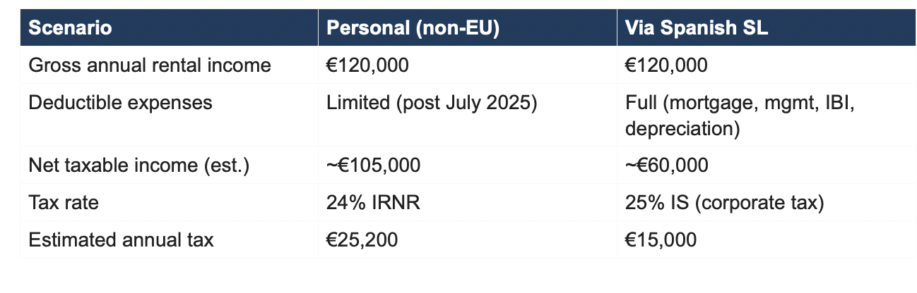 This is where the SL delivers its clearest advantage. Consider a non-EU resident (US, UK, Middle Eastern buyer) renting out a Marbella villa. Under personal ownership, they face a flat 24% IRNR (Non-Resident Income Tax) with zero expense deductions.